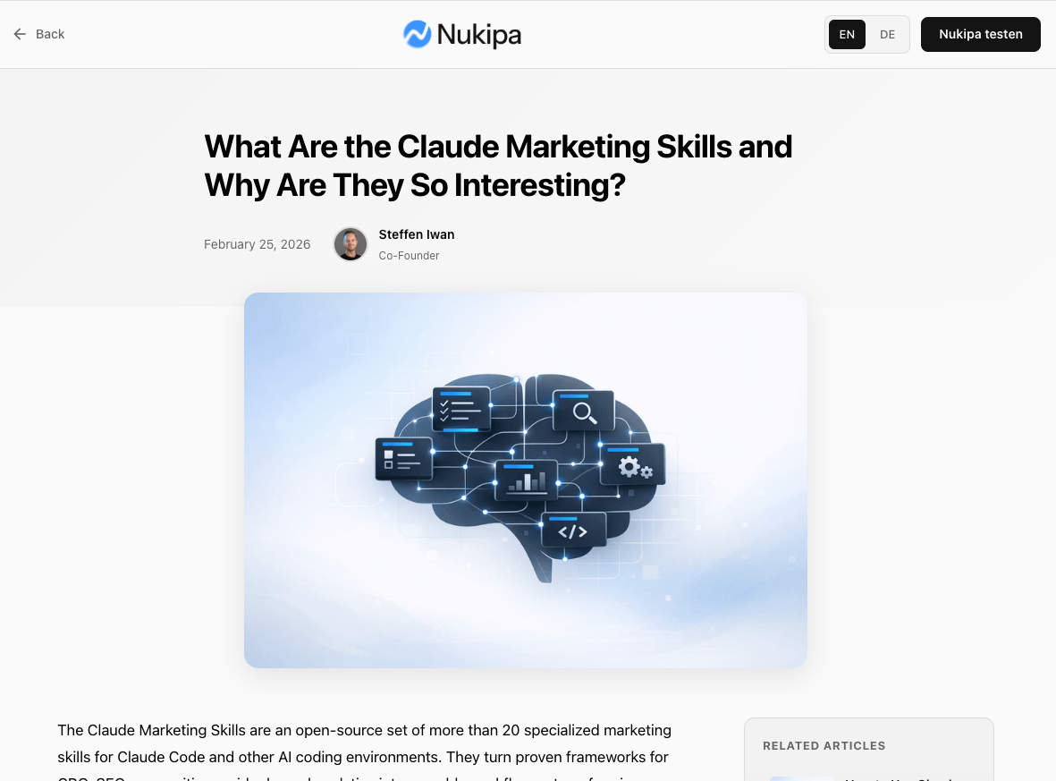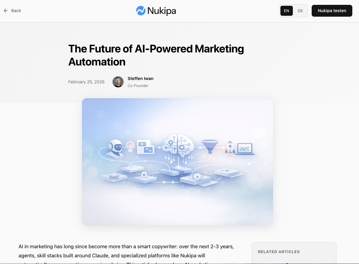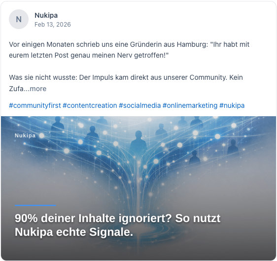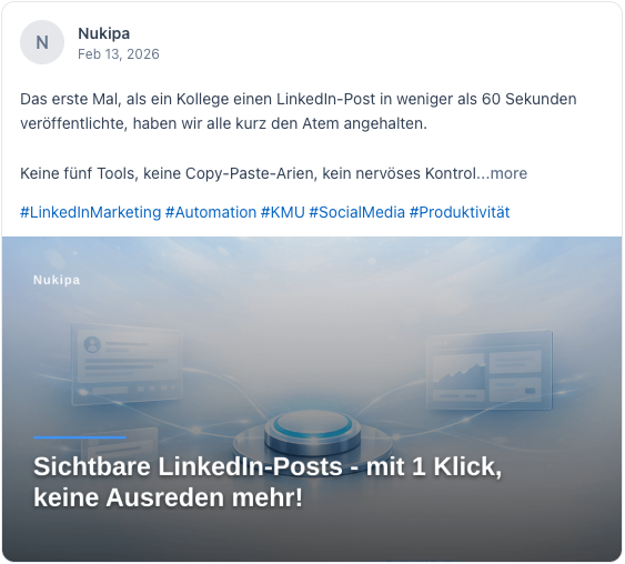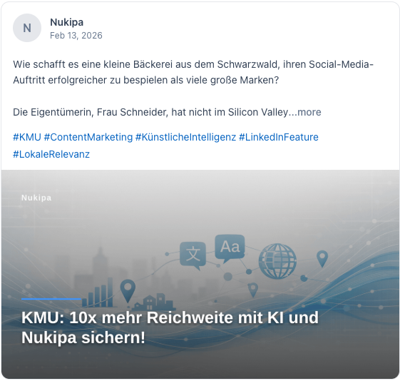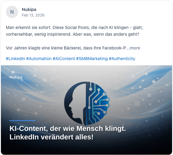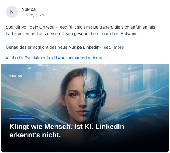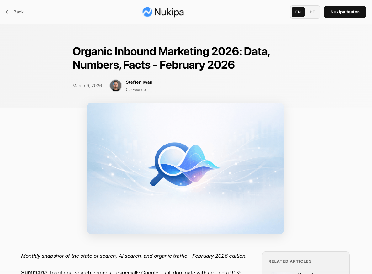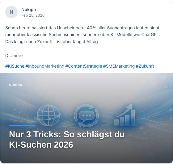 Nukipa schreibt deine Blog-Artikel, erstellt deine LinkedIn-Inhalte und sorgt dafür, dass Kunden dich finden, bei Google und in KI-Suchen wie ChatGPT. Vollautomatisch. Entwickelt für B2B-Unternehmen.