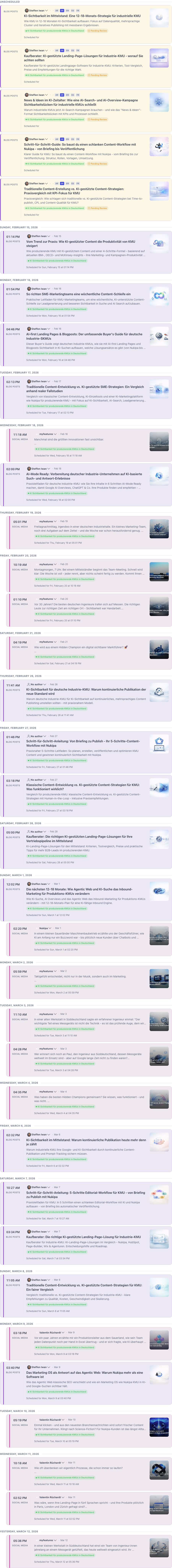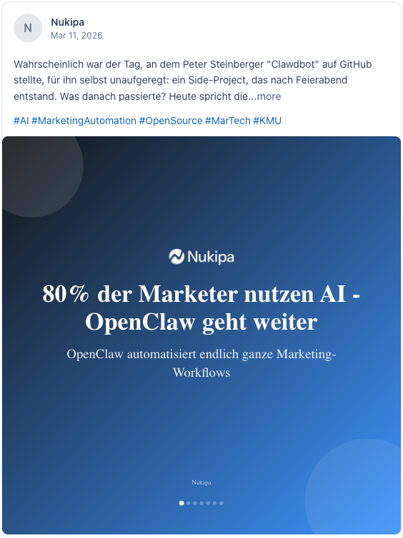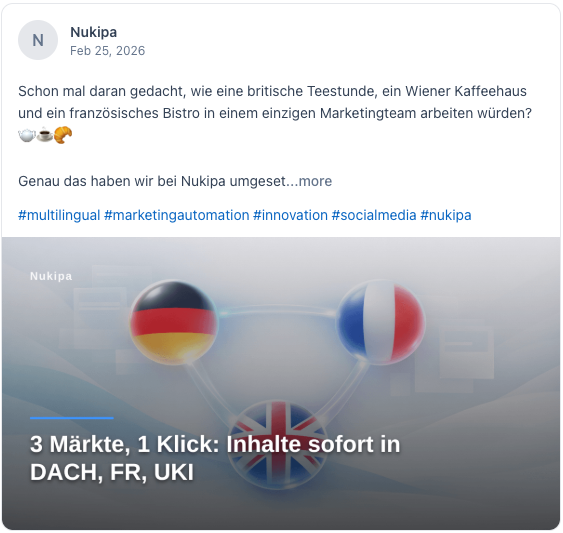 Nukipa füllt deinen Content-Kalender automatisch. Blogbeiträge, Social Media, mehrsprachig — alles geplant, geprüft und bereit. Du musst nur noch freigeben.